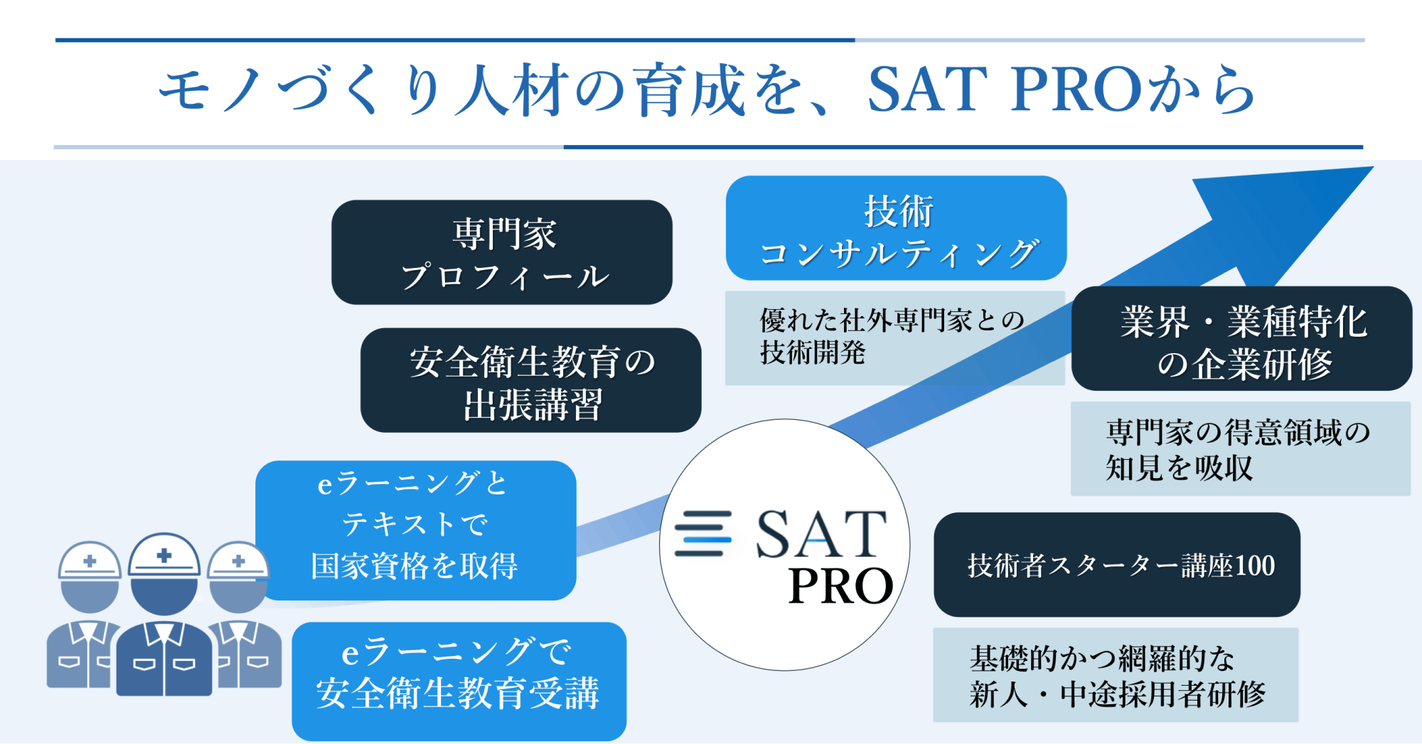 SAT PROでは、「現場」をもつ企業の皆さまに必要な、専門領域の知見を深化させるプログラムから、法的な安全衛生教育まで、多種多様な企業研修プログラムをご用意しております。